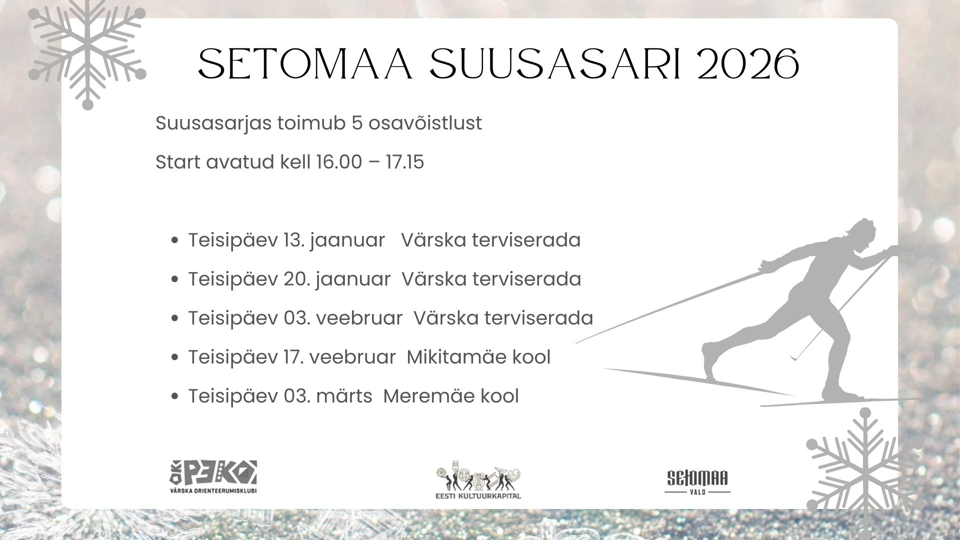 Aeg ja koht: jaanuar – märts 2026.a. Värska terviserada, Mikitamäe kool, Meremäe kool. Eesmärk: Programm: Suusasarias toimub 5 osavõistlust Start avatud kell 16.00 – 17.15 Teisipäev 13. jaanuar Värska terviserada Teisipäev 20. jaanuar Värska terviserada…