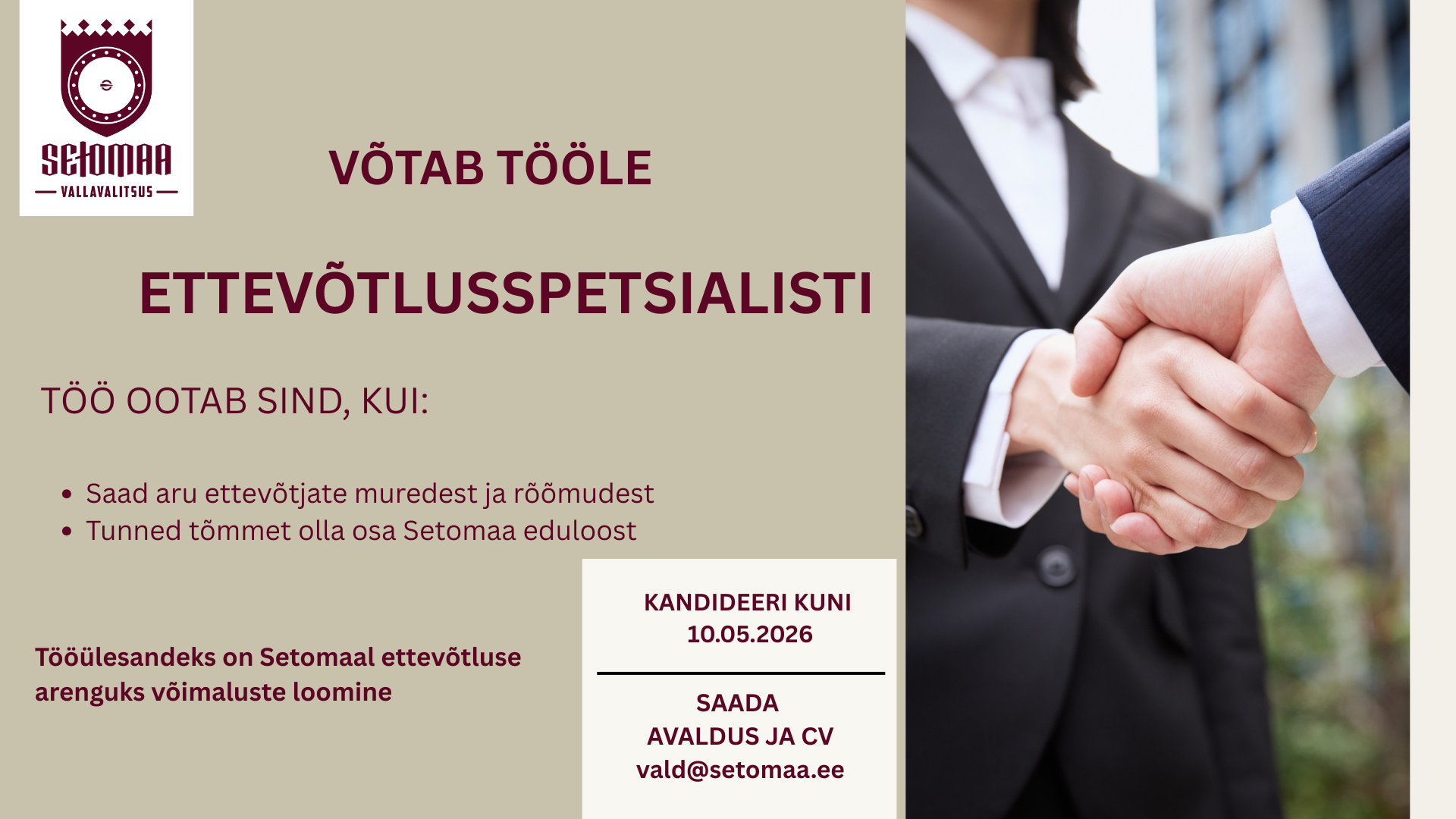 Setomaa vallavalitsus pakub tähtajatut tööd ettevõtlusspetsialistile. Töökoha asukoht: Setomaa vald, Võru maakond Tööaeg: osaline tööaeg (koormus 0,6), tööleping Töösuhte kestus: tähtajatu Tööle asumise aeg: niipea kui võimalik TÖÖÜLESANDED: Ettevõtlusspetsialisti peamiseks tööülesandeks on ettevõtluse toetamine ja…