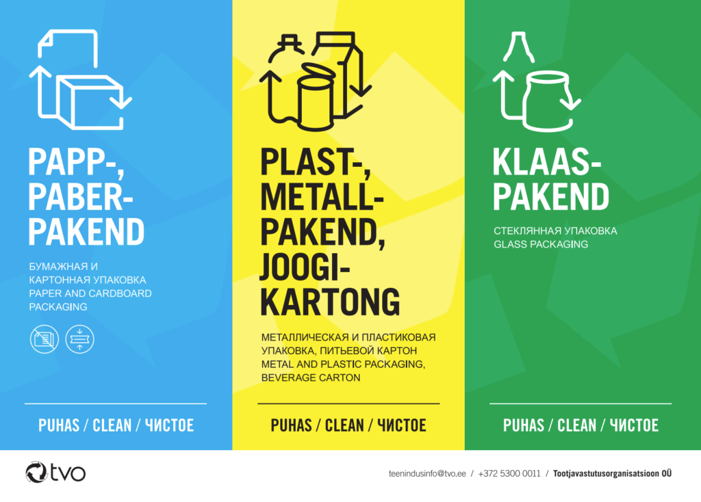 Kõik Tootjavastutusorganisatsioon OÜ avalike pakendipunktide asukohad ja tühjendusgraafikud ning sorteerimise juhendid leiab kodulehelt: www.tvo.ee.