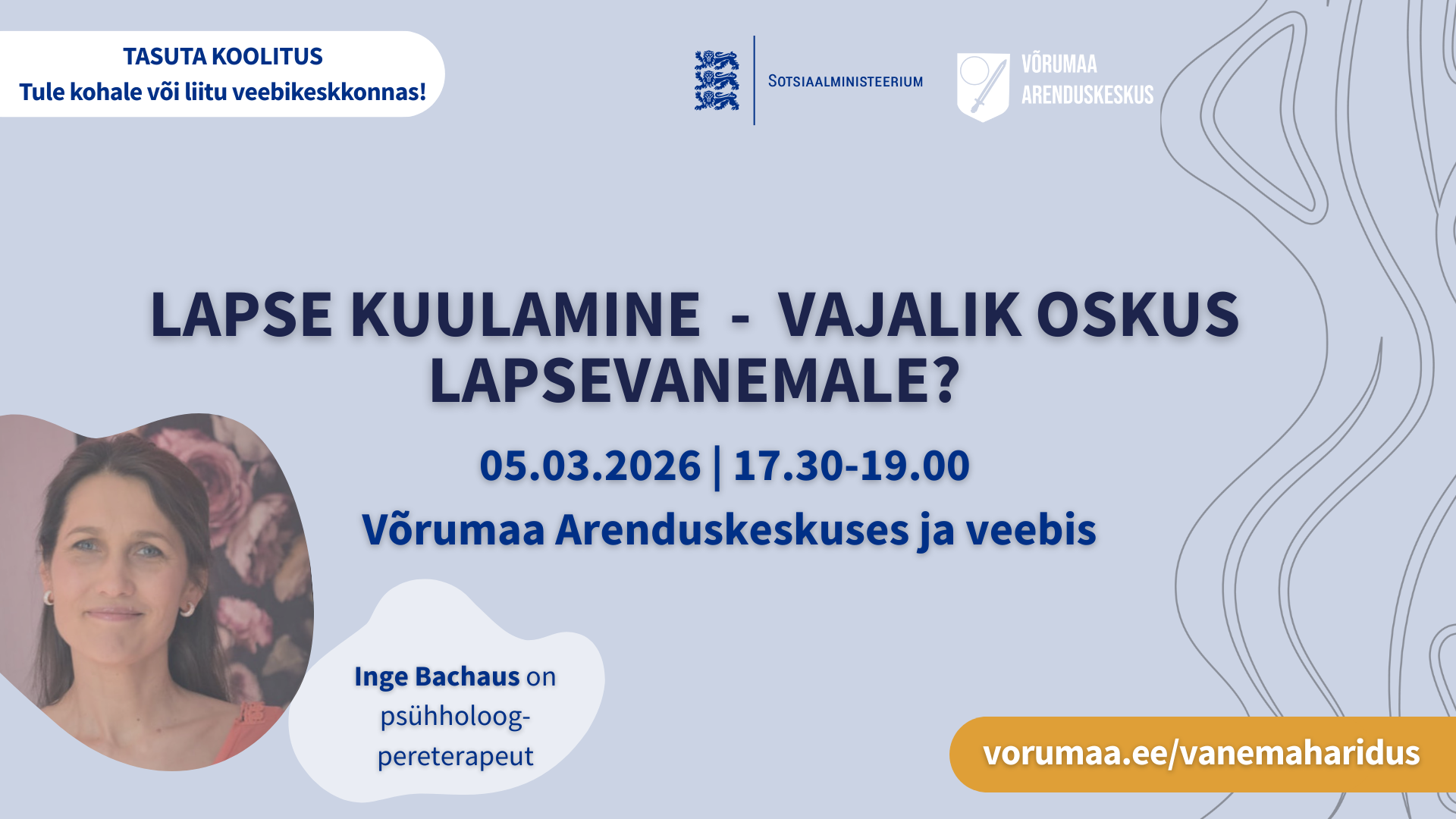 • 05.03.2026. Lapse kuulamine – vajalik oskus lapsevanemale? Kell 17.30-19.00. Võrumaa Arenduskeskuses ja veebikeskkonnas. Koolitaja Inge Bachaus.